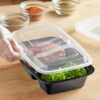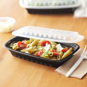 Coming as a combo, this black container includes a clear, tight-fitting lid for optimal product visibility and protection from messes and spills. Its ample capacity makes it perfect for housing salads, pastas, and entrees, and its flat top and bottom ensures easy stacking in to-go bags. Use it for packaging food at your kiosk, food truck, convenience store, or restaurant!