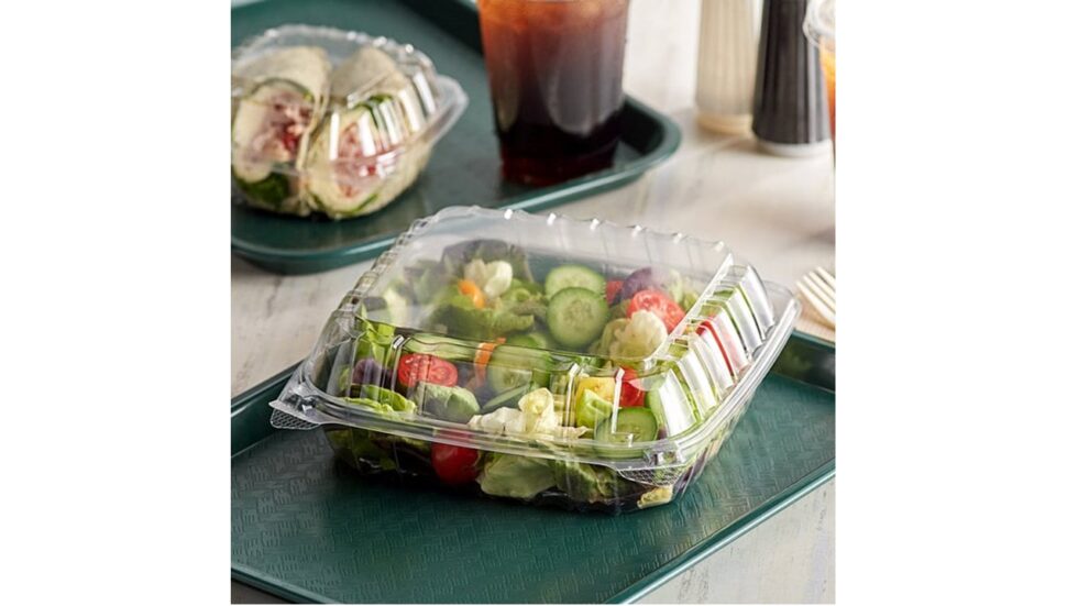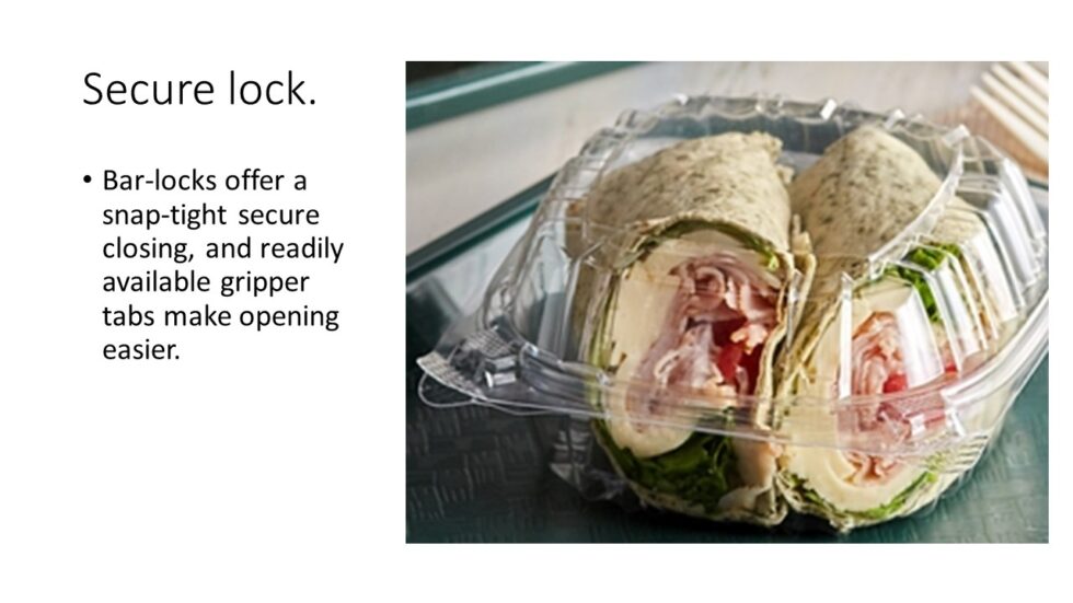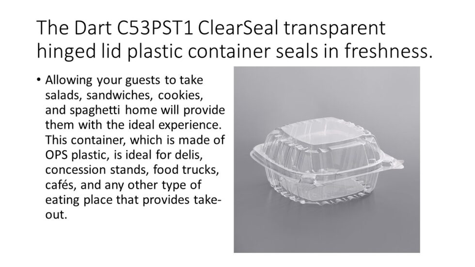 - Allowing your guests to take salads, sandwiches, cookies, and spaghetti home will provide them with the ideal experience. This container, which is made of OPS plastic, is ideal for delis, concession stands, food trucks, cafés, and any other type of eating place that provides take-out.