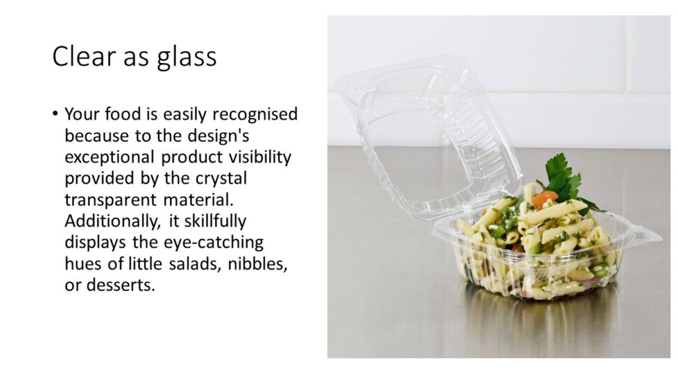 - Your food is easily recognised because to the design’s exceptional product visibility provided by the crystal transparent material. Additionally, it skillfully displays the eye-catching hues of little salads, nibbles, or desserts.