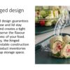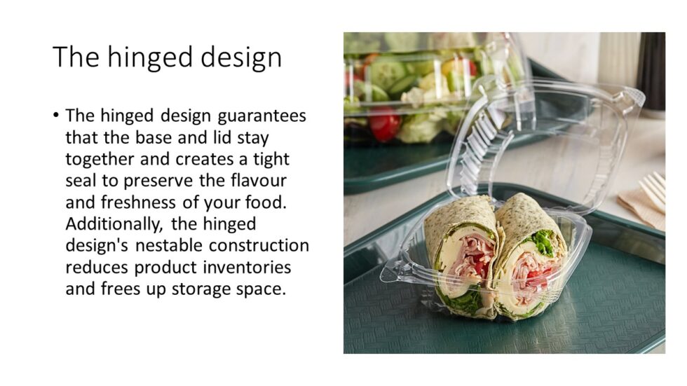 - The hinged design guarantees that the base and lid stay together and creates a tight seal to preserve the flavour and freshness of your food. Additionally, the hinged design’s nestable construction reduces product inventories and frees up storage space.