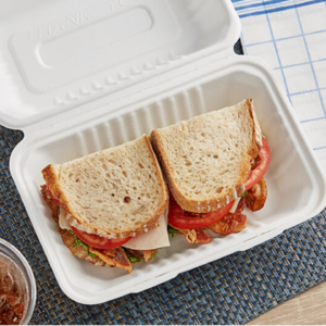- žThis square takeaway box is 100% compostable and made from sugarcane or bagasse material to lessen the environmental effect of your business. This may be reused and recycled, unlike other throwaway items that are burned when thrown away and contribute to air pollution. Additionally, you may use the incredibly tough material for a range of cuisines because it is cut and grease resistant!