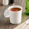 Made from double poly-coated paperboard, the cup is durable and moisture resistant, allowing it to hold liquids and hearty foods without leakage. Plus, the rolled rim is smooth to the touch, making it easy for customers to sip on soup when they’re in a hurry and don’t have time for sit-down lunch or dinner.