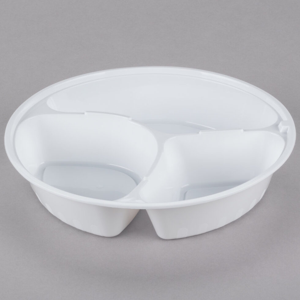 With this Choice 33 oz. White 9″ round 3-compartment container with lid, your takeout service will be improved right away!