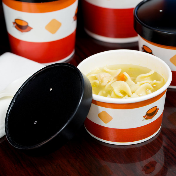 Engage your customers by offering to-go soups, stews, chilis, and more in this paper hot food cup. Featuring colorful imagery, this container serves as an advertisement for hungry guests passing through your convenience store, cafe, or grocery store. While the bright, colorful graphics are sure to draw attention, the sleek black lid provides a striking contrast to the container itself, too.