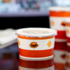 Perfect for delis, markets, or salad bars, this colorful orange and white Choice 8 oz. paper hot food cup and lid combo provides a great presentation for your take-out hot food items!