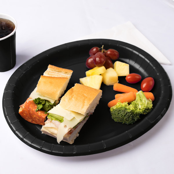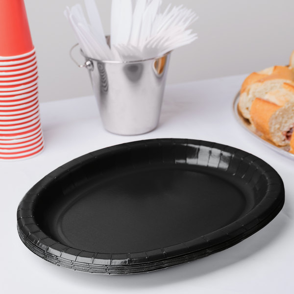 Everything begins with colour! This 12″ x 10″ Black oval paper platter from Creative Converting is ideal for parties, buffets, and catered events. Its Blazk Velvet colour enhances your dining environment and can be readily combined with other colours to complement your event’s theme and decor. This heavy-duty platter is made from premium-strength paper and is able to support robust dishes!