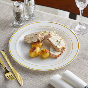 This plate is made from high-impact polystyrene, making it impervious to condiments and cutlery. In addition, the plate’s superior rigidity prevents it from bending under the weight of weighty foods. This impact plastic dinnerware aligns more closely than foam options, allowing you to save valuable storage space, while the wide rim prevents food from spilling off the plate.
