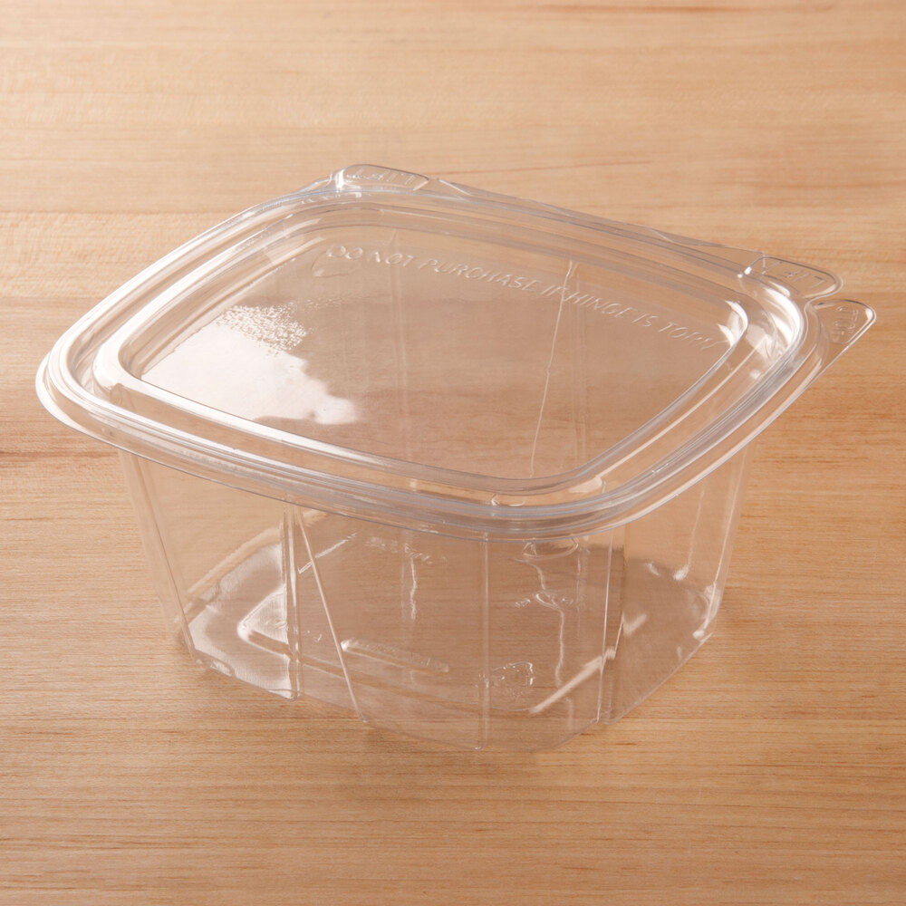 This PET plastic container’s tamper alert hinge remains attached to the container, eliminating loose plastic pieces as well as the need for shrink bands and wrap labels. This saves your business time and money, and reduces waste. The tamper alert hinge sticks out when torn, making it clear to customers when the container has been opened.