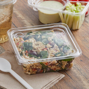 Securely seal a variety of food items with this Dart ClearPac SafeSeal 24 oz. tamper-resistant, tamper-evident hinged container with flat lid. Specifically designed to inhibit tampering, this 24 oz., square container comes with Dart’s tamper alert hinge, which protrudes outward when torn, alerting your customers that the container has been opened. This PET plastic container’s tamper alert hinge remains attached to the container, eliminating loose plastic pieces as well as the need for shrink bands and wrap labels – saving your business time and money, all while reducing waste. Use this container to hold bulk food, dips, salads, granolas, fruits, and veggies at your deli, salad bar, or grab-and-go counter.