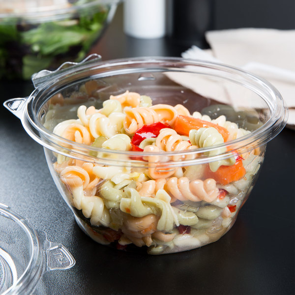 With this Dart SafeSeal 16 oz. plastic bowl with dome top, you can make sure that your visitors’ food is safe. You invest money, time, and effort into ensuring that the food that leaves your commercial kitchen is made with quality and food safety in mind. This hinged bowl provides a strong barrier against damaging tampering after it is placed on the shelves of your deli, bakery, or grocery shop. This gives you and the client piece of mind as they take your freshly made salads, pastas, and entrees to go.