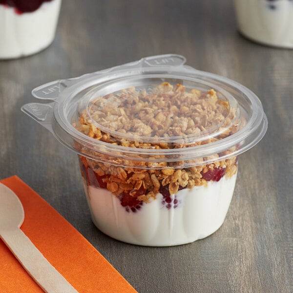 Not only is this cup the ultimate defense mechanism against contamination, but its sleek, stylish build is designed to showcase your fresh, vibrant foods. The crystal clear construction makes it easy for the customer to view your house-made fruit cups or assorted bulk snacks.