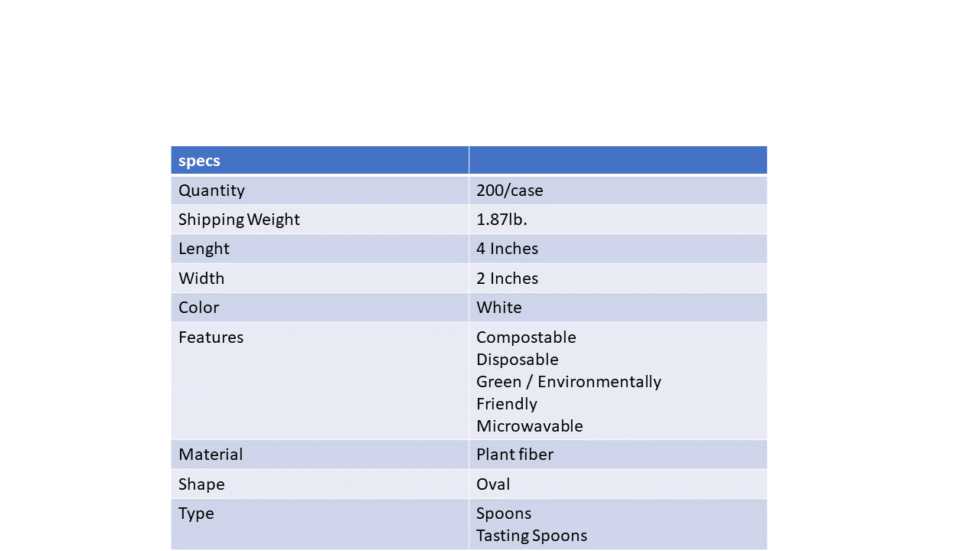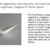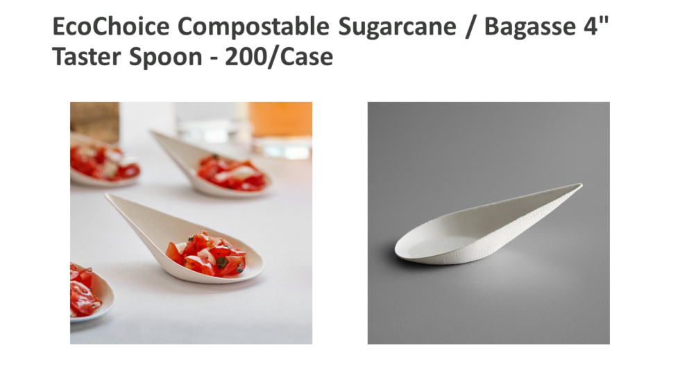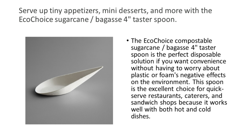 - The EcoChoice compostable sugarcane / bagasse 4″ taster spoon is the perfect disposable solution if you want convenience without having to worry about plastic or foam’s negative effects on the environment. This spoon is the excellent choice for quick-serve restaurants, caterers, and sandwich shops because it works well with both hot and cold dishes.