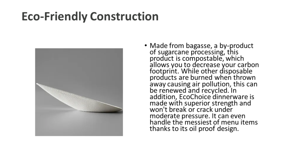 - Made from bagasse, a by-product of sugarcane processing, this product is compostable, which allows you to decrease your carbon footprint. While other disposable products are burned when thrown away causing air pollution, this can be renewed and recycled. In addition, EcoChoice dinnerware is made with superior strength and won’t break or crack under moderate pressure. It can even handle the messiest of menu items thanks to its oil proof design.