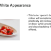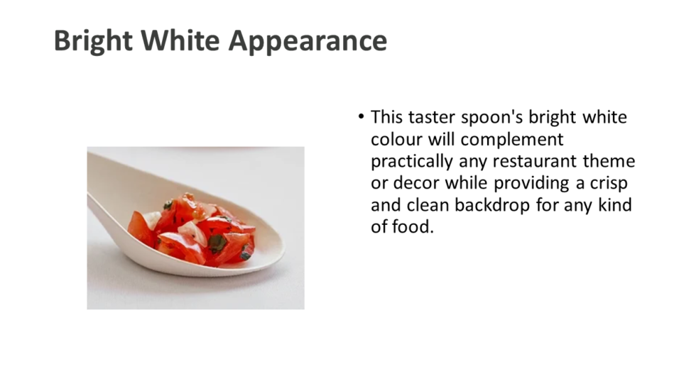 - This taster spoon’s bright white colour will complement practically any restaurant theme or decor while providing a crisp and clean backdrop for any kind of food.