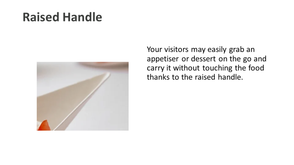 - Your visitors may easily grab an appetiser or dessert on the go and carry it without touching the food thanks to the raised handle.
