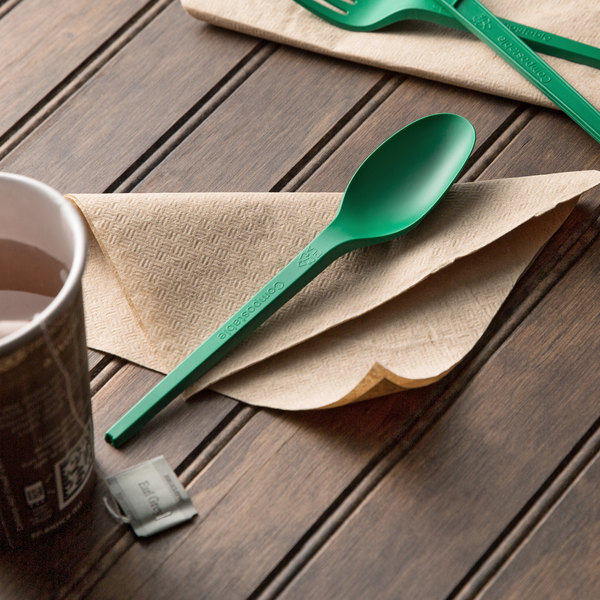 Provide a great alternative to standard plastic flatware with this EcoChoice heavy weight 6 1/2″ green CPLA plastic spoon!