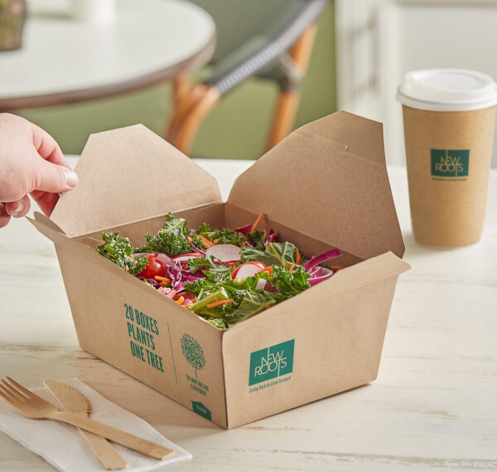 - With this New Roots kraft PLA-lined biodegradable #4 take-out container, you can make a difference in your neighbourhood! This environmentally friendly solution is great for organisations looking to lower their environmental impact while also giving back to the community. This product, packaged in bulk, is ideal for high-volume use in your bakery, restaurant, bistro, or catered event