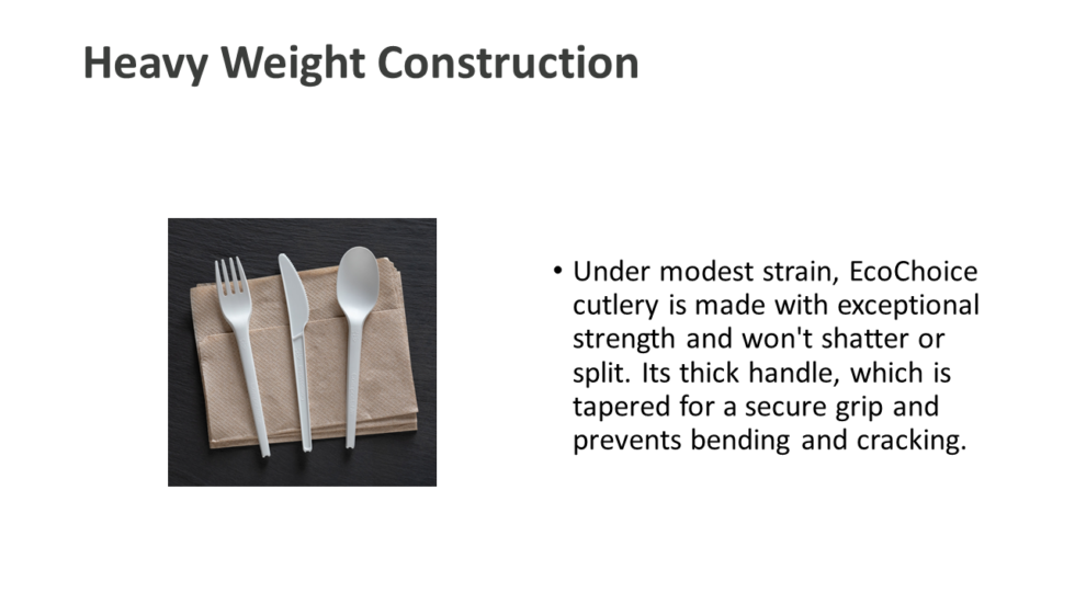 - Under modest strain, EcoChoice cutlery is made with exceptional strength and won’t shatter or split. Its thick handle, which is tapered for a secure grip and prevents bending and cracking.