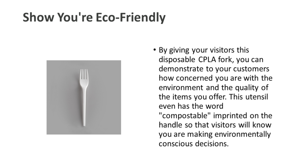 - By giving your visitors this disposable CPLA fork, you can demonstrate to your customers how concerned you are with the environment and the quality of the items you offer. This utensil even has the word “compostable” imprinted on the handle so that visitors will know you are making environmentally conscious decisions.