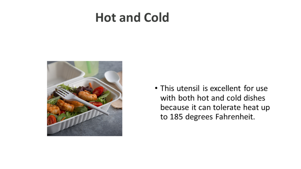 - This utensil is excellent for use with both hot and cold dishes because it can tolerate heat up to 185 degrees Fahrenheit.