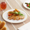 Serve your signature main courses on an elegant plate without the hassle of cleaning using this white plastic plate with gold bands from Visions!