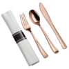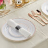 Plastic cutlery with a rose gold finish and traditional styling makes them look like real silverware. The plates’ banded design and high-end appearance also lend an air of sophistication.