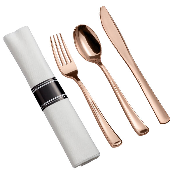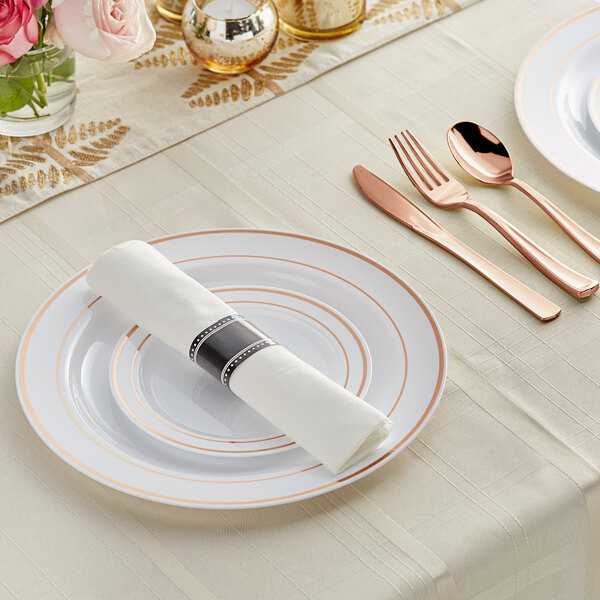 This banded plastic dinnerware set by Visions Rose has traditional rolled silverware for an elegant presentation at the table.