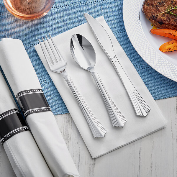 With this pre-rolled and ready-to-use white linen-like napkin and silver heavy weight plastic flatware set, you’ll save time and labor when catering events and hosting wedding receptions. This all-inclusive set is simple for your guests to transport from the buffet to their table and is disposable for a speedy cleaning!