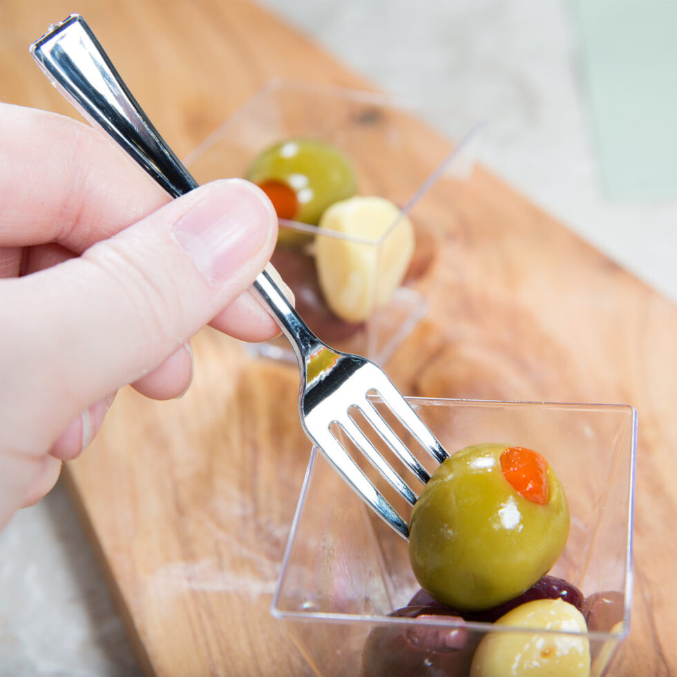 This silver heavy weight plastic sampling fork from Visions is an elegant and practical addition to parties and catered events. Use it to serve appetizers and desserts! Its 4 inch length fits comfortably in the hand and makes it ideal for scooping up bite-sized foods. In addition, its disposable design assures a speedy cleanup after your guests have finished eating.