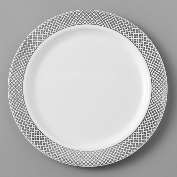 This elegant Silver Visions white plastic plate measures 6 inches in diameter and features a silver lattice design.